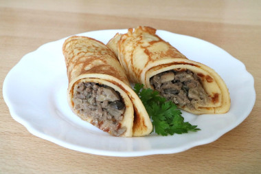 Hotovou směsí naplňte připravené palačinky a zaviňte. Podávejte jako rychlou večeři. Naplněné palačinky je možné také narovnat do vymaštěného pekáčku, zalít rozšlehanými osolenými vejci, popř. posypat strouhaným sýrem. Podávejte se zeleninovým salátem.